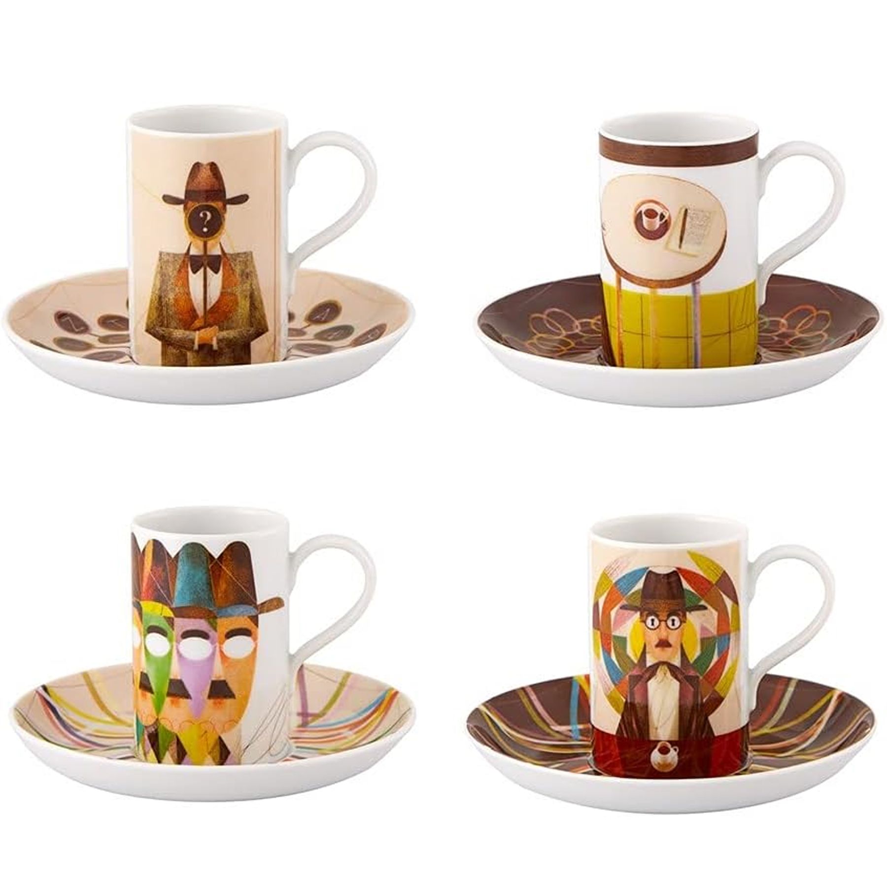 - É uma coleção em porcelana que homenageia o poeta Fernando Pessoa. Diferente da linha "Heterônimos" (assinada por Catarina Pestana), esta versão é assinada pelo ilustrador português Gonçalo Viana (GV) e destaca-se pelo estilo geométrico e cores inspiradas no cubismo. - Design: Assinado por Gonçalo Viana, com ilustrações que interpretam a figura de Fernando Pessoa de forma moderna. - Instruções de uso: Lavar com sabão ou detergente neutro e esponja macia. O uso de lava-louças e microondas não é recomendado.